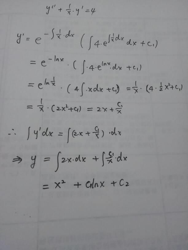 y''+y'/x=4,此时先对y'按照通式公式来求解,再对y'积分求解得到y,通解中含有两个常数系数c1和c2,此时P=1/x,Q=4。