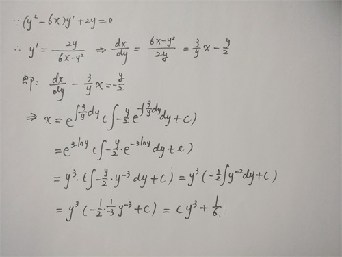 此例中,要反过来用一阶非齐次线性微分方程的通解公式,其中:p(y)=-3/y,q(y)=-y/2.