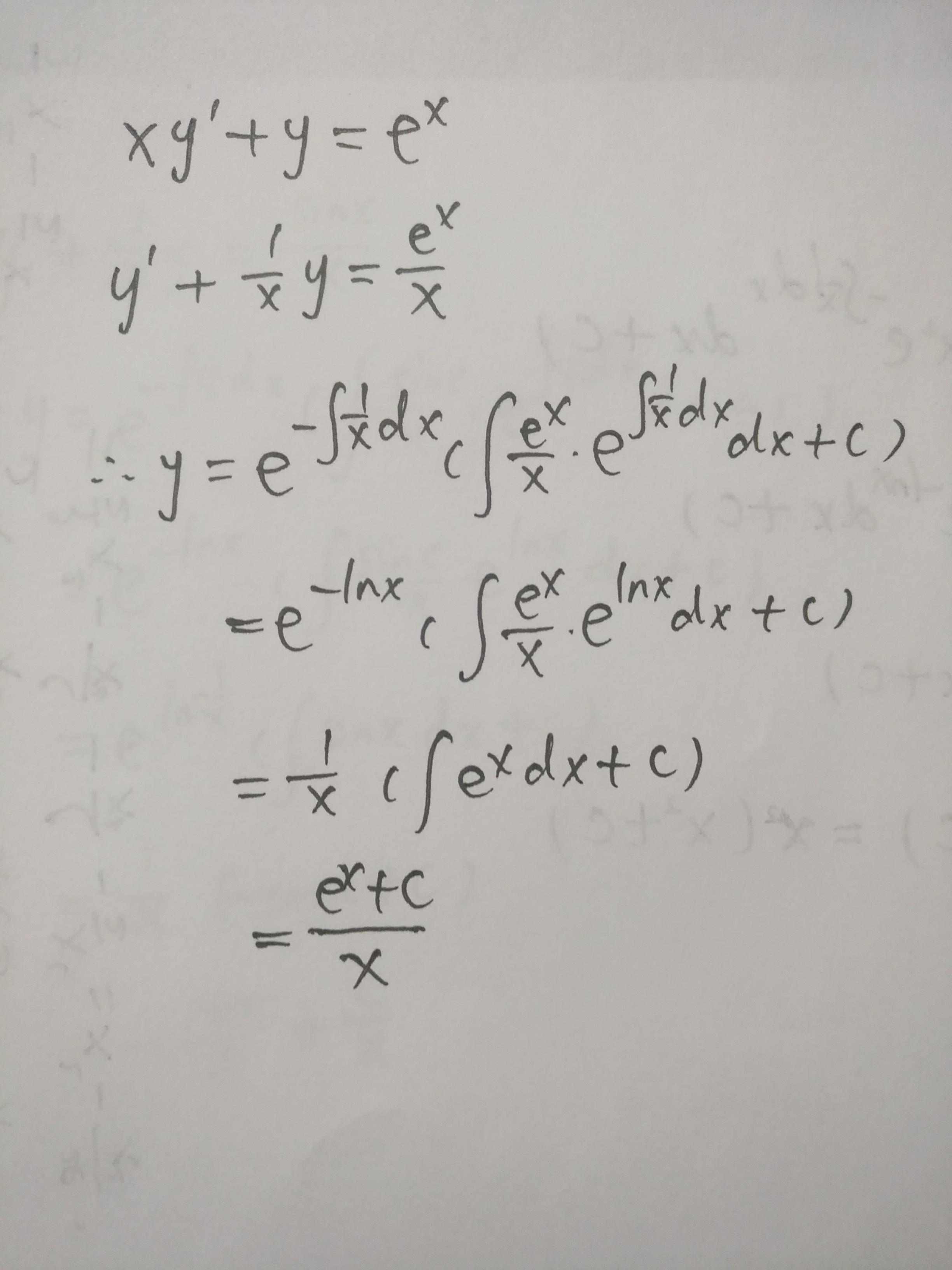 本例中,先要将y'前面的系数x变形除后,得到:p(x)=1/x,q(x)=e^x/x.