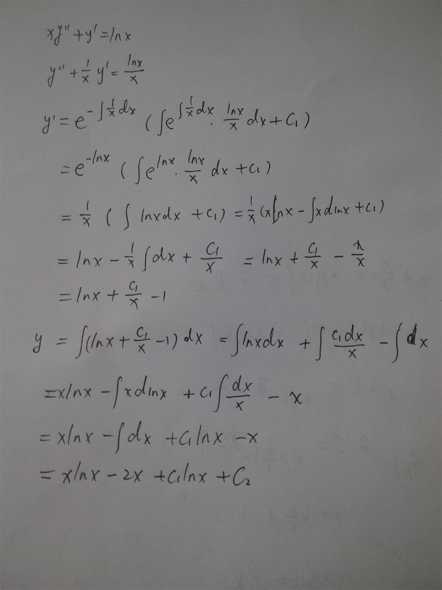xy''+y'=lnx,此时先对y'按照通式公式来求解,再对y'积分求解得到y,通解中含有两个常数系数c1和c2,此时P=1/x,Q=lnx/x.