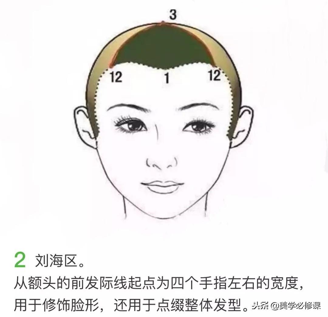 2.刘海区,从额头的发际线起点为四个手指左右宽度,用于修饰脸型,还用于点缀整体发型。