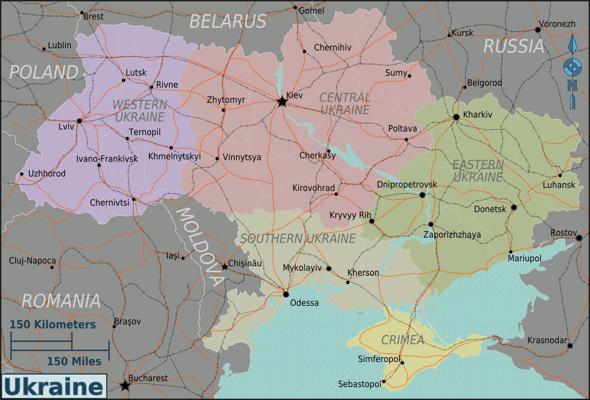 下面的地图就更加清楚了,乌克兰全国可以分成五个部分:西乌克兰、中乌克兰、东乌克兰、南乌克兰、克里米亚。