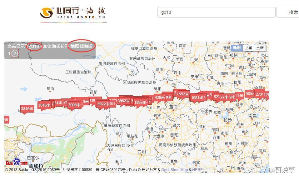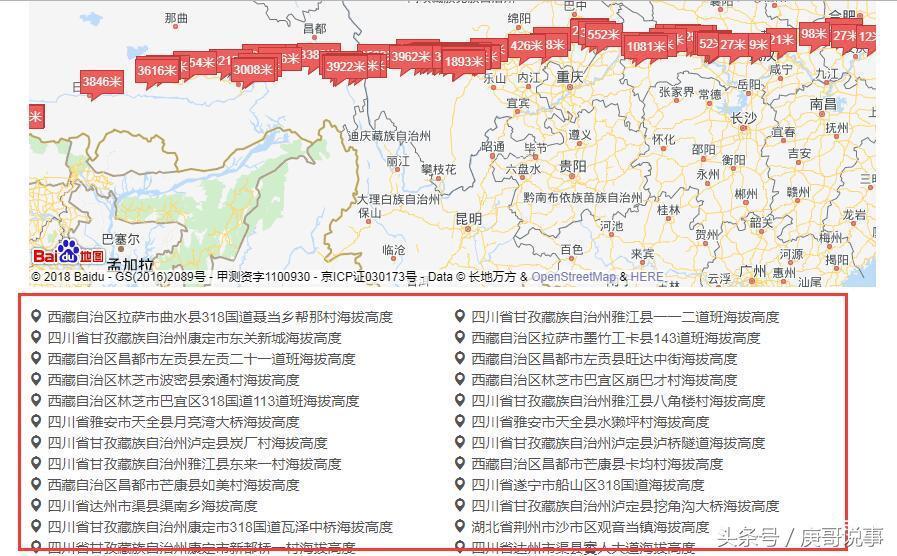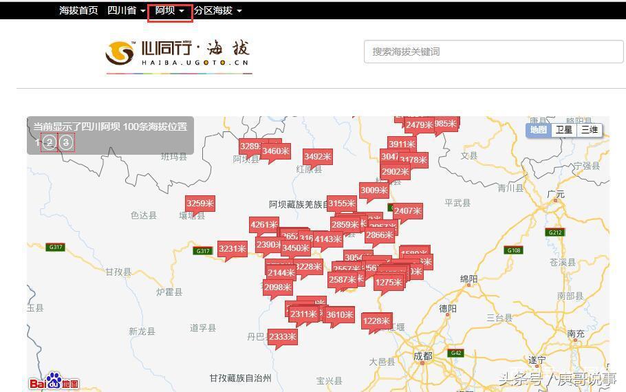 三、每页结果最多显示100条海拔高度结果,并全部显示在地图上,可以放大缩小!这样显示方式看海拔高度非常直观