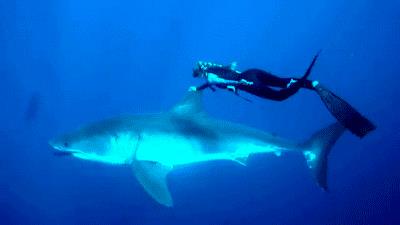 英勇的潜水员与有海底“恶霸”之称的大鲨鱼