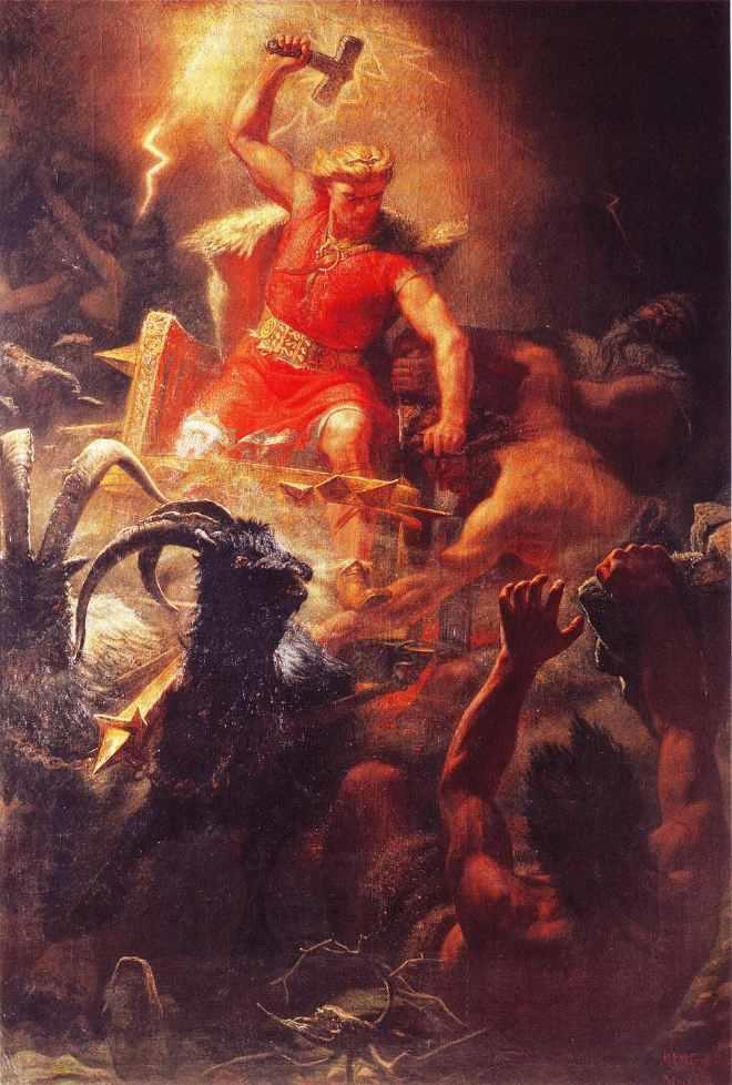 尤弥尔吃着欧德姆布拉分泌的奶水维生,而欧德姆布拉则舔食寒冰上的盐粒。在母牛的舔舐下,冰中则出现诸神之祖布利。布利生下包尔,包尔和女巨人贝斯特拉生下了三兄弟奥丁、威利、维。巨人族和诸神相当不合,双方挑起战火。后来尤弥尔被诸神所杀,巨人族战败,剩下的巨人逃往约顿海姆并继续对诸神抱持着恨意。