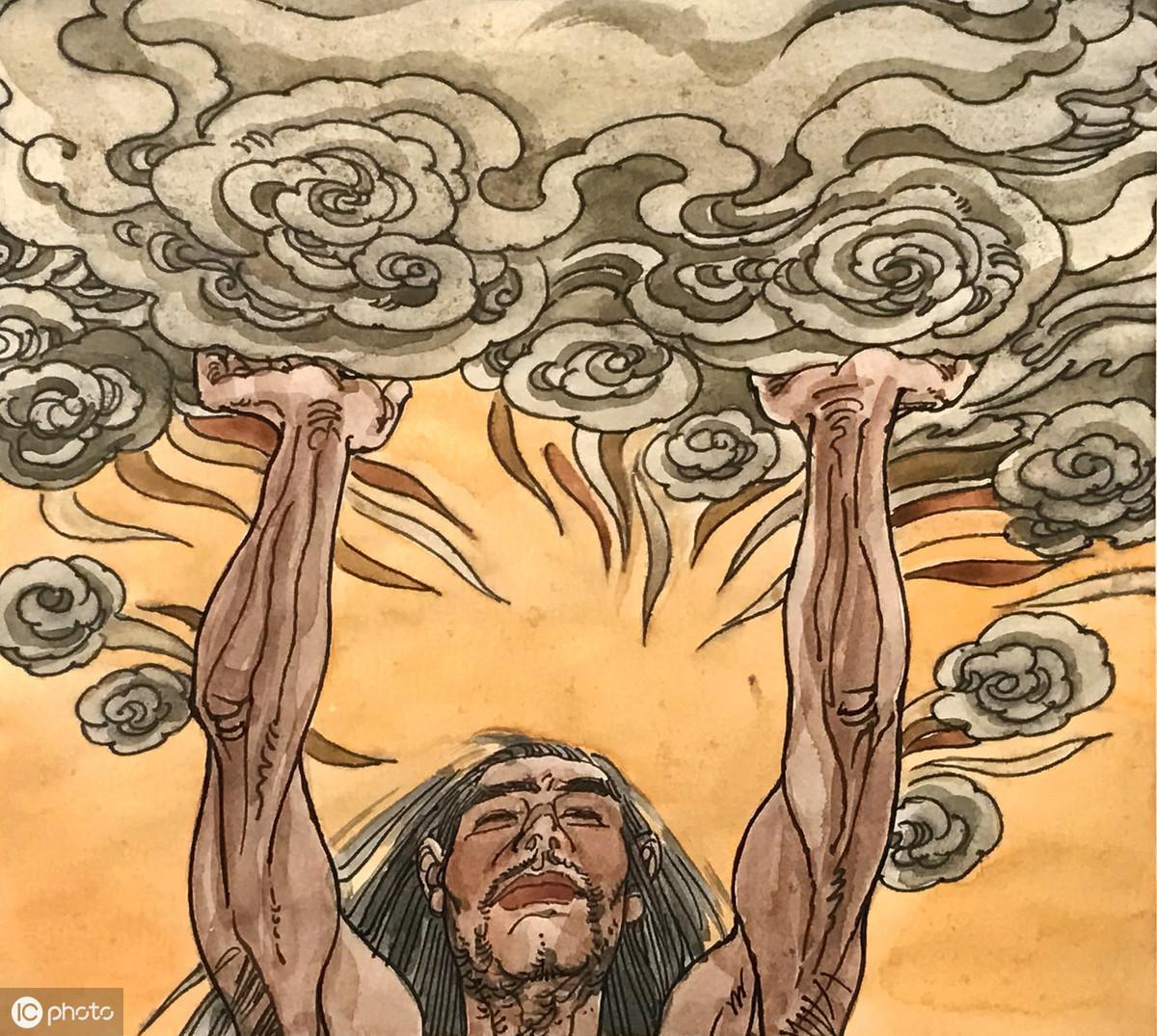 他孤独地站在那里,做这种非常吃力的工作,又一个一万八千年。到后来,天和地的构造似乎已经逐渐成形了,他不必再担心它们会合拢了,他实在也需要休息休息,终于倒下了。