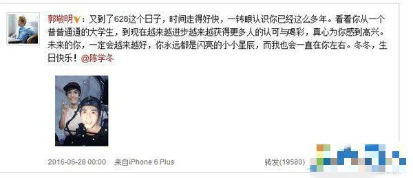 借由人气电影《小时代》小鲜肉陈学冬迅速走入人们的视线中,而陈学冬和郭敬明的感情相信大家也有耳闻,近日他们又“舔屏”了6月28日是陈学冬生日,好友郭敬明[微博]第一时间更新微博为他庆生,还晒出了两人的合影和生日蛋糕,郭敬明称:“又到了628这个日子,时间走得好快,一转眼认识你已经这么多年。看着你从一个普普通通的大学生,到现在越来越进步越来越获得更多人的认可与喝彩,真心为你感到高兴。未来的你,一定会越来越好,你永远都是闪亮的小小星辰,而我也会一直在你左右。