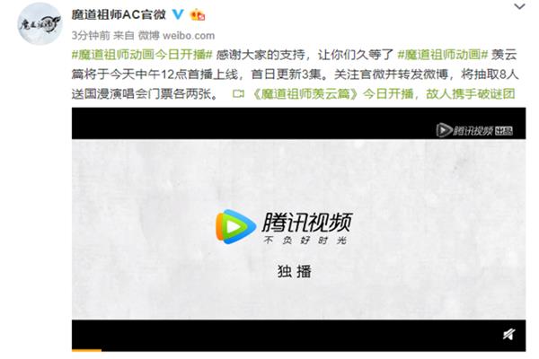 官宣!魔道祖师第二季羡云篇今天8月3日12点开播!连更三集
