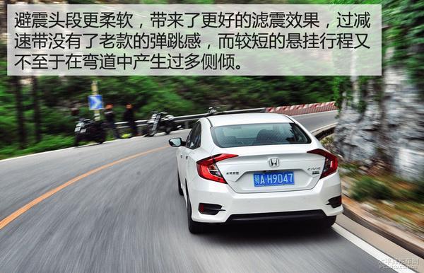 思域的整体驾驶感受是轻柔、舒适而且够快。“轻柔”体现在转向上,非常轻盈和灵敏,这给日常驾驶和稍微激烈点的驾驶都能带来好的体验;其次,“舒适”则是悬挂的特点,思域难能可贵地将日系车自成一派的悬挂风格打破,也就是避震头段过硬导致弹跳感的问题。新思域悬挂则吸收了德系车的标准,悬挂行程变短,避震头段变软,这样做的好处是过滤掉了路面的颠簸和弹跳,但弯道又不会带来较大的侧倾。导致整体的架势体验有很大提升:开起来很舒服,但又很灵敏。