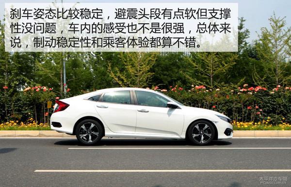 制动距离在40米内。思域的制动表现和悬挂表现都不错,制动过程很平稳,刹车踏板的力度也很均匀,悬挂的行程不长,支撑性也不错,所以整个刹车效率还是很高的,车身姿态也保持得不错。最终成绩也符合同级别车型的中上水平。