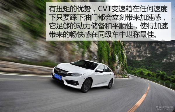 思域这台CVT变速箱表现可圈可点,思域的这套1.5T+CVT的组合要比同级别任何一台搭载双离合车型的表现都更好,它丝毫没有如我们司空见惯的以拖沓的表现压抑涡轮增压发动机的天性。