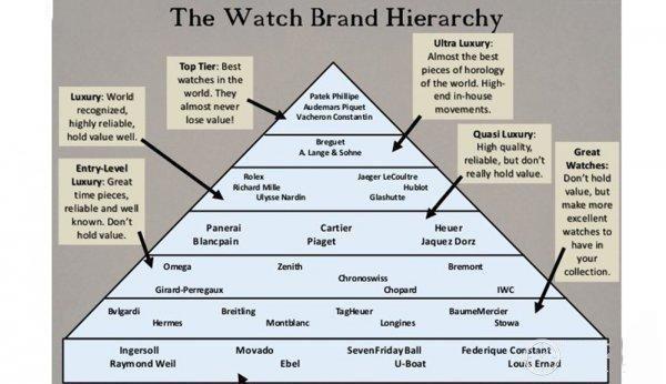 我还是说明一下,这张分级图,是单纯的手表品牌分级,其中分级加入了“保值因素”,我还是举主要品牌。从低往高说。