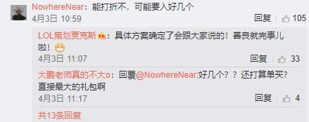 除了上架时间之外,热情的网友们也是在微博下方提问策划大大,有人问到这次的皮肤有没有什么优惠?比如说打折或者礼包之类的。策划大大表示现在具体方案还没有定下来,等定下来一定会告诉大家的。