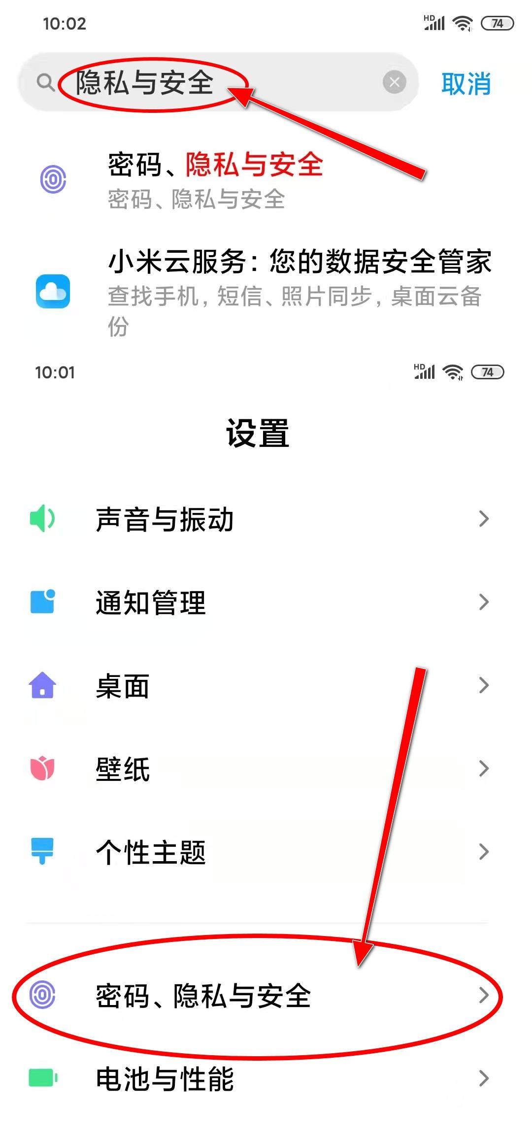 1、打开手机的设置界面,在搜索栏“输入隐私与安全“”或直接在下面找到密码、隐私与安全选项。