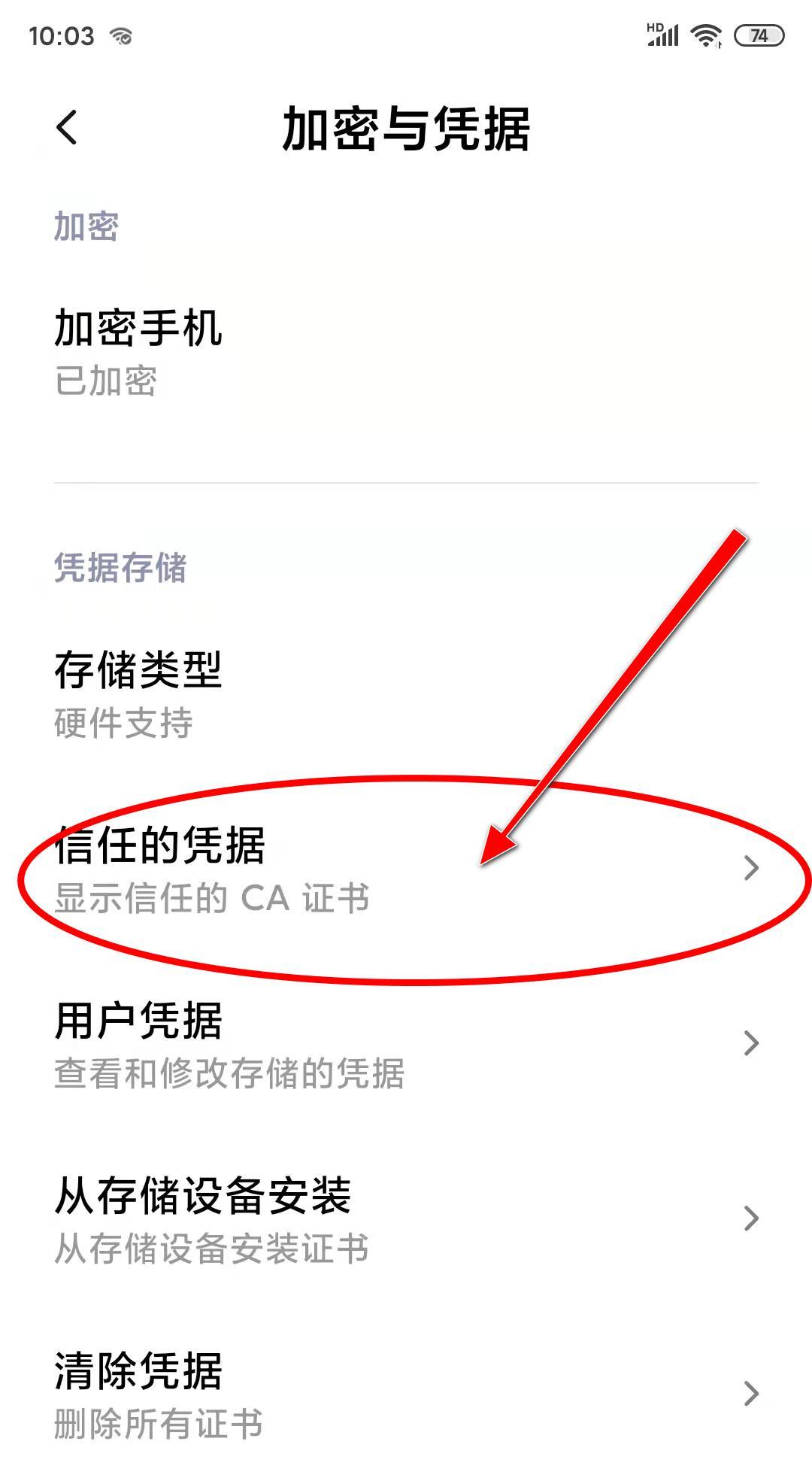 3、再打开的系统安全界面在点击“加密与凭据”里的“信任的凭据”选项。