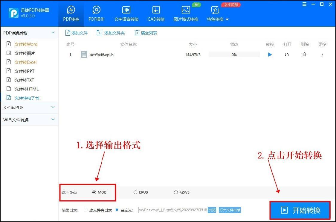 添加进来之后,在左下角点击MOBI,点击开始转换即可完成转换。