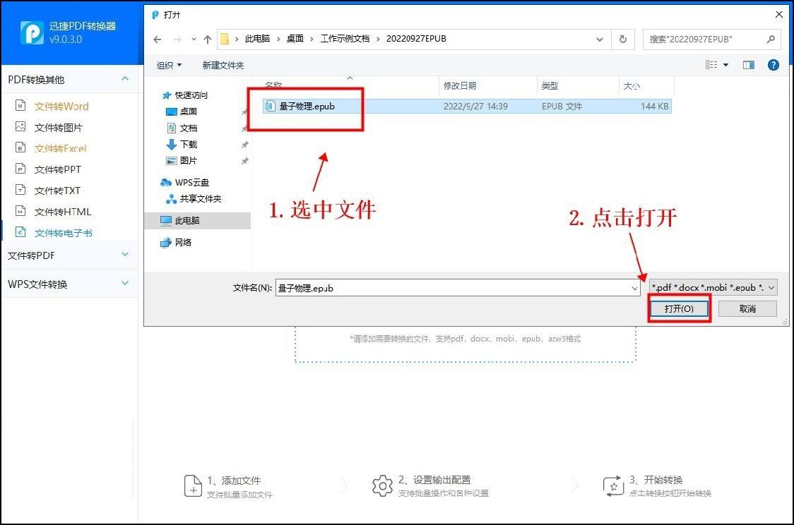 其次,在窗口中选中EPUB文档,点击打开,就可以把需要转换的EPUB文件添加进来。