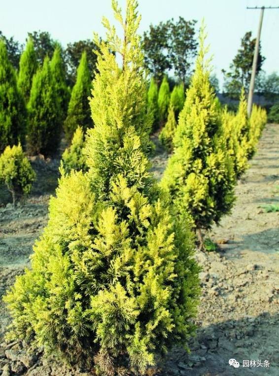 柏科乔木,成品苗高度在5米至6米之间,树冠呈宝塔型,叶色春夏秋三季均为亮丽的金黄色。喜光耐寒,耐旱性极强,耐粗放管理,生长速度缓慢,对土壤要求不严,是园林中不可多得的彩色针叶乔木。