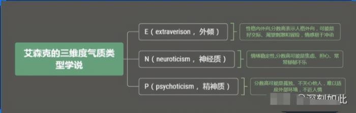 艾森克把许多人格特质都归结为:内外倾、神经质和精神质三个基本的维度上,并用E(extraverison, 外倾)、N(neuroticism, 神经质)和 P(psychoticism, 精神质)来构成人格的三维度模型。