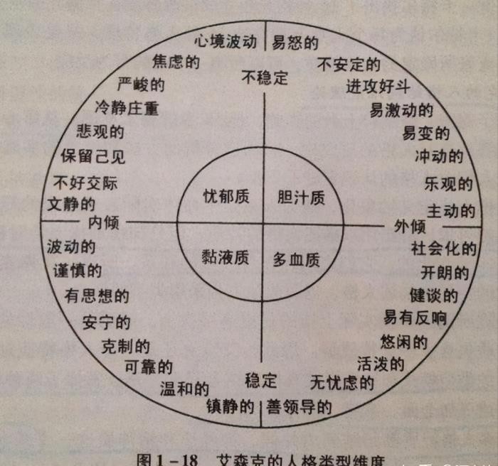 艾森克根据其中的「内外向」和「神经质」两个维度把人划分为四种人格类型。