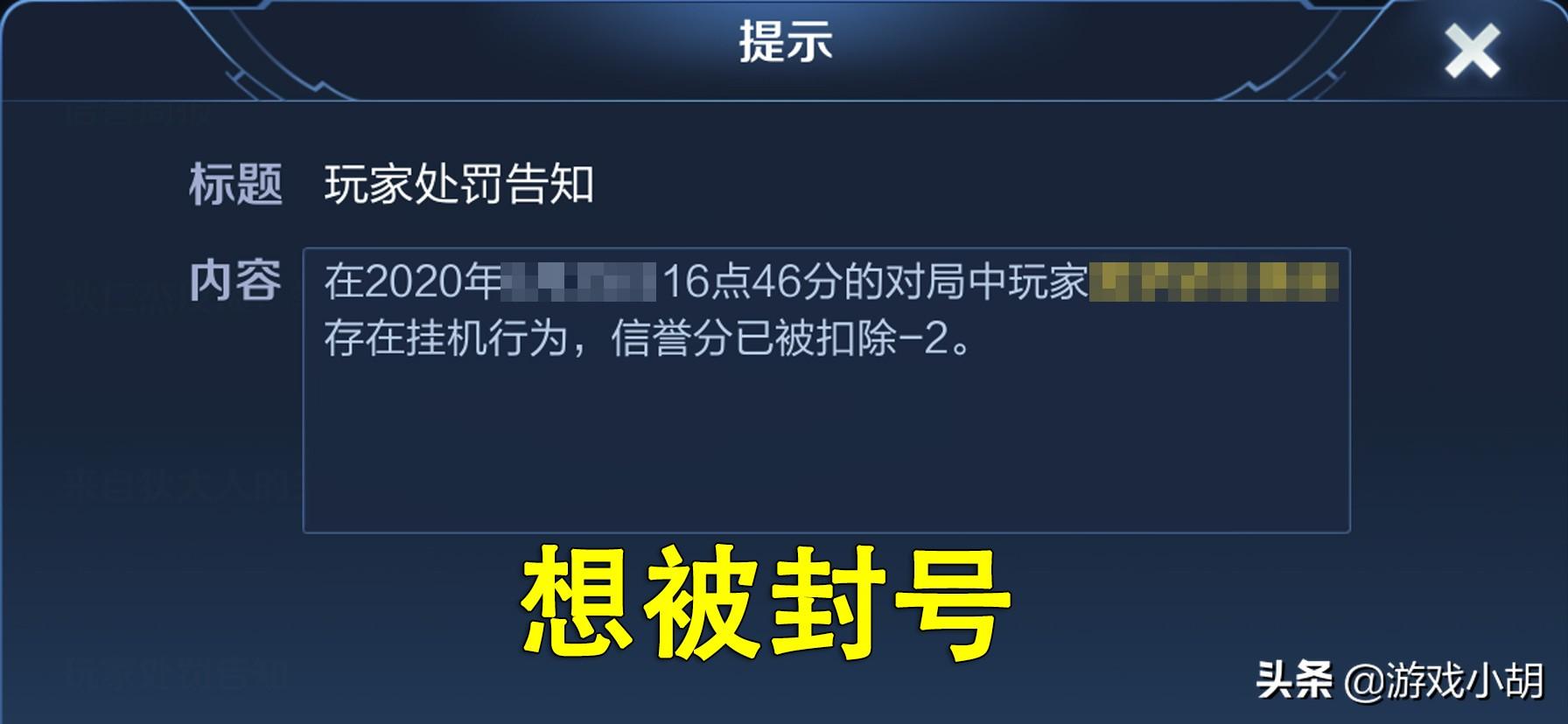 最简单的方法是挂机。每一局都挂机,而且还是抢了C位后挂机。第一天被扣了很多分而无法打排位;第二天被扣了很多分无法玩匹配;第三天又扣了很多分,连娱乐模式都无法玩了。玩家运气还算不错,没过多久就收到了“封号提醒”,官方封号60天!