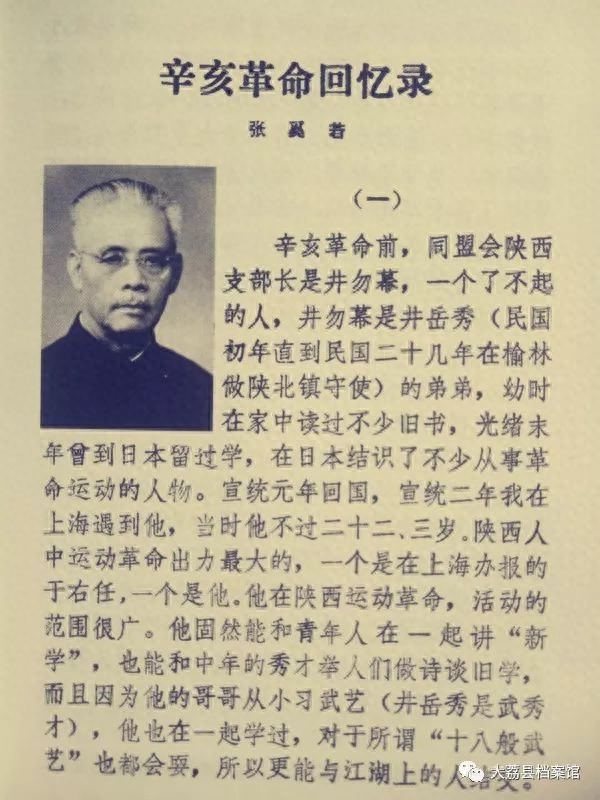 张奚若,在青年时就加入“同盟会”,并参加了辛亥革命。辛亥革命前夕,井勿幕(西安城墙小南门就是以他的名字命名的)派年轻的张奚若前往日本购买军火,准备在陕西举义。途中,张奚若被清军抓捕武器还没运回来,武昌起义爆发了。不久,张奚若再去日本,将军械运回陕西,成为陕西辛亥革命的功臣。之后写有《回忆辛亥革命》(张奚若口述,丕强记录并整理,最早发表于1947年4月16日至5月5日的上海《文汇报》,同年11月印为单行本出版,改题《辛亥革命回忆录》,1962年以《回忆辛亥革命》为题收入《辛亥革命回忆录》第一集),对辛亥革命前后国内外形势及陕西响应武昌起义,光复西安的动态,作了详细的记述。