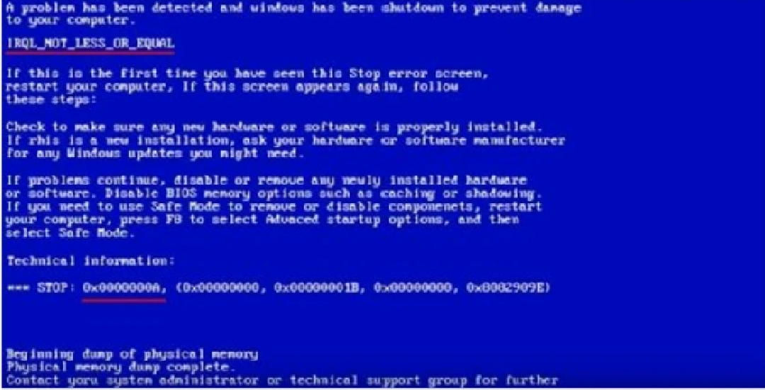 1、蓝屏代码:Ox0000000A