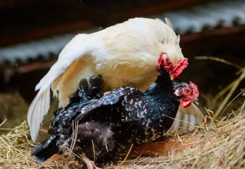 在这个过程中,我们看不到的是公鸡的屁股已经开始去找母鸡的屁股,当它们的泄殖腔都对准了以后,公鸡的精子就会射入到母鸡体内,然后就让和母鸡的卵“鸡蛋”完成受精。