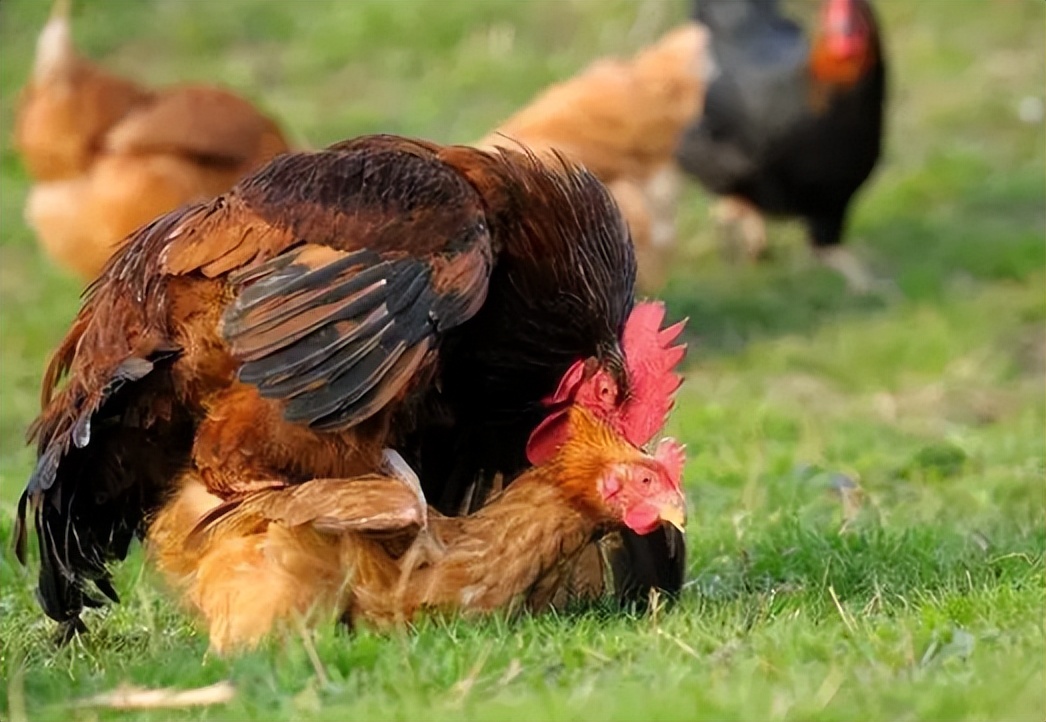 飞奔过来,然后母鸡站在不动,公鸡就会才在它的身上。不懂的人以为这是公鸡和母鸡打架了,回去帮忙驱赶,那实际上是误会了,这样会坏了它们的好事情。