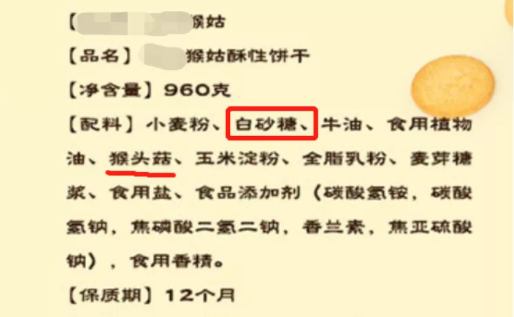 ▲图:某品牌猴头菇饼干配料表