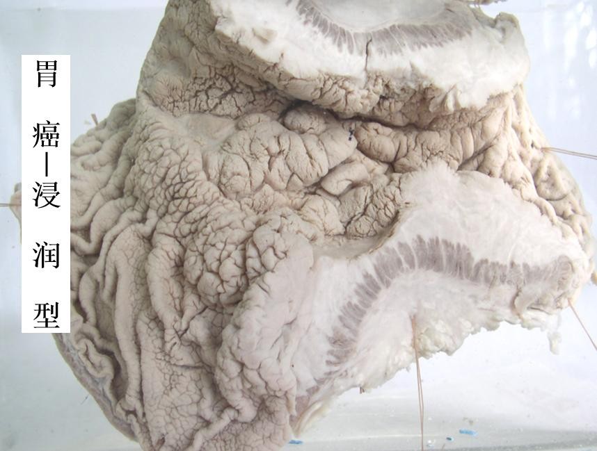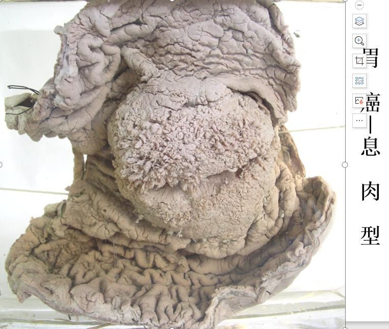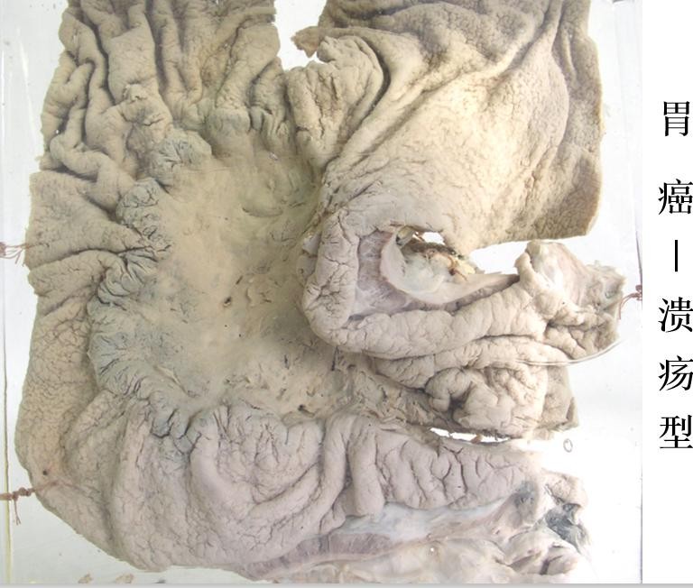 上面三张图片为中晚期胃癌的大体类型, 分为息肉型、溃疡型和浸润型三型。