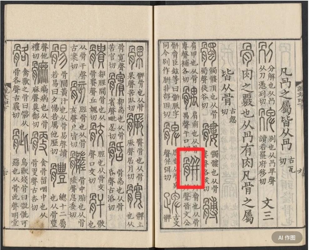 看这张图片,左右两页均布满了古汉字及其注解,仿佛是一部打开时空之门的秘籍。这些文字主要以小篆字体书写,每一个字都蕴含着深厚的历史底蕴。在这些文字中,“鄄”字被红色方框标出,显得格外醒目。它的部首是“骨”,这让我们不禁联想到古人对于汉字的精妙分类和构造理解。而“鄄”字的注音为“古愿切”,这更是揭示了它读音的奥秘。
