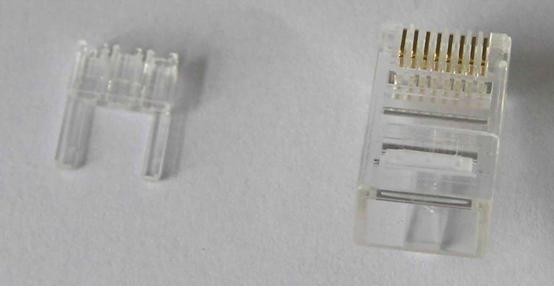 六类网线需要用到六类水晶头,而六类水晶头和传统的五类水晶头不同,六类水晶头分为内部分线件和外壳,首先我们要将他拆分。