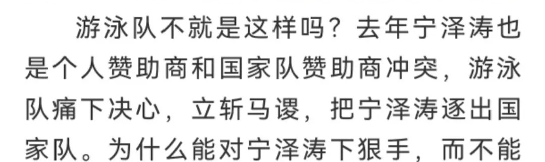 当年奥运会国家游泳队的代言是蒙牛、361,宁泽涛却私自接了伊利、阿迪达斯的代言,还都是官方代言的竞品,这就是文章中提到的蒙牛跟伊利资本恶性竞争使宁泽涛成为斗争牺牲品,其实是因为宁泽涛仗着当时如日中天的流量自己作死。有意思的是,文章的撰写人只敢污蔑国货品牌蒙牛,半个字都不敢提另一个竞品代言阿迪达斯。杨毅的说法也佐证了这点。