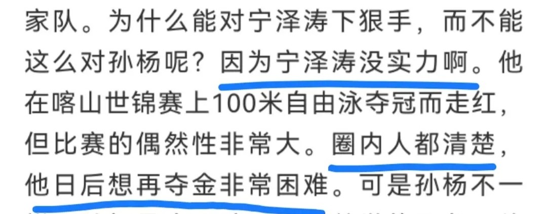 首先,关于宁泽涛的“超强潜力”,体育届可能有不同看法。下图是CCTV5知名体育解说员杨毅发表的看法,他认为宁泽涛的实力并没有一部分群众认为的那么强,一次世锦赛的成绩也算不了什么。