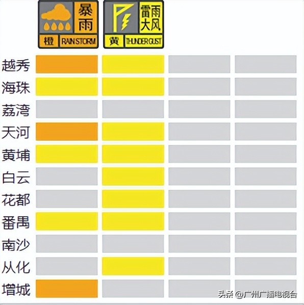 广州多区暴雨预警信号生效中