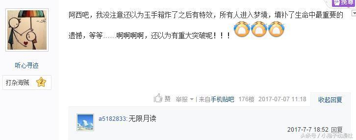 玉手箱一炸就出现了第一张图萨博救艾斯的路飞的景象,不少人由于太激动没有看仔细右上角的尾田亲绘假象剧情。于是艾斯马上就要复活的消息漫天飞了,还有人YY玉手箱有无限月读的功能!更夸张的是玉手箱类似月光宝盒能让人穿越时空。