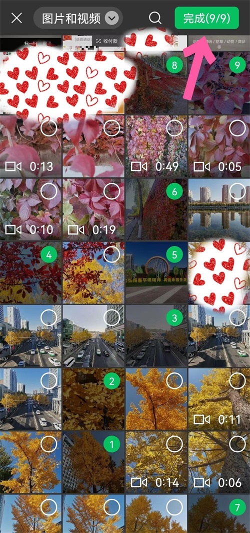 接下来就进入到您的手机图库了, 可以选择照片或者视频。照片建议选择1张,3张6张或9 张(最多可以选9张), 看着比较整齐。 视频的时间要控制在30秒以内。 照片或者视频选好后, 点击右上角的【完成】