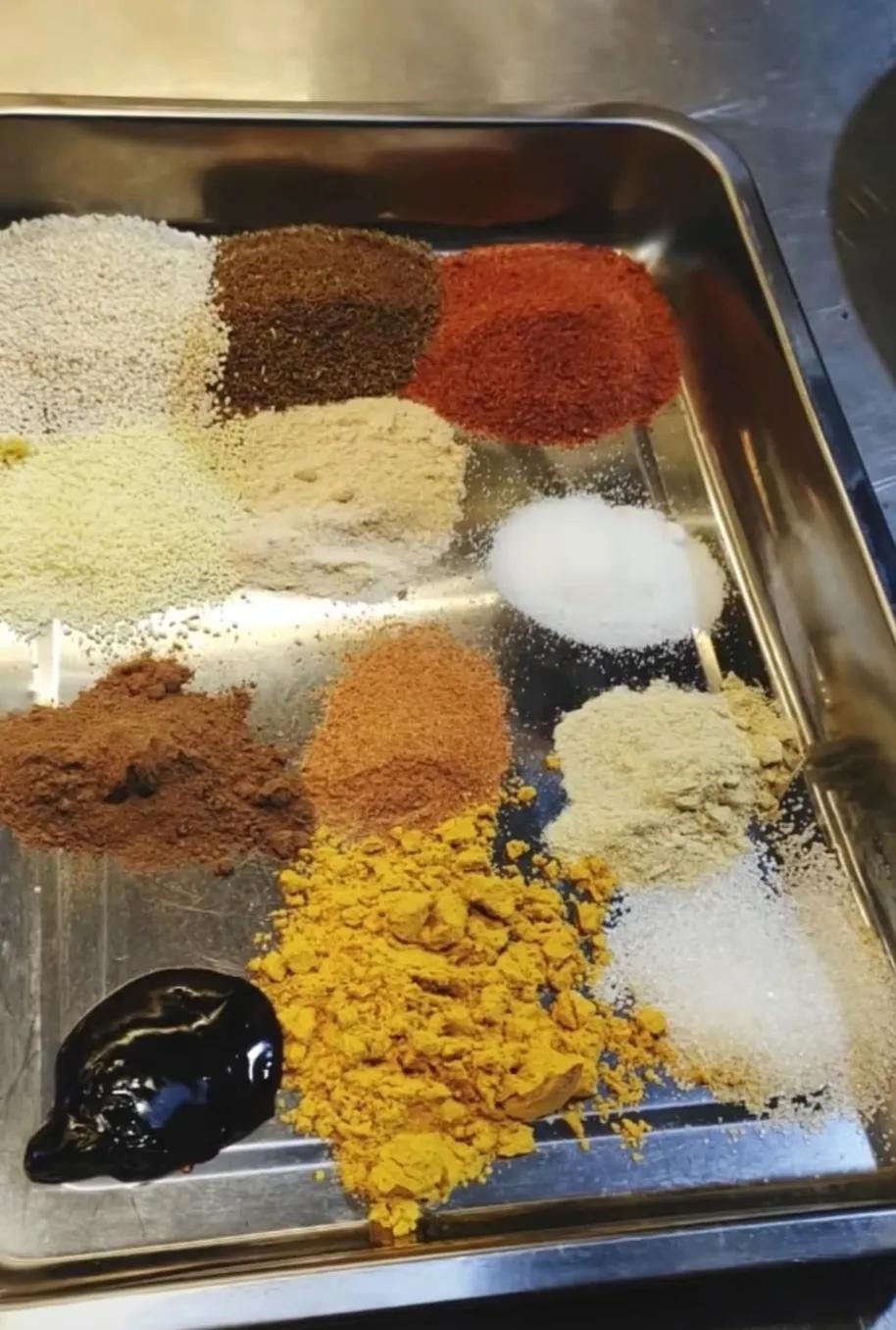 首先第一步我们把配料准备好,需要的配料有:辣椒粉20克,孜然粉20克,白芝麻20克,盐5克,鸡粉5克,鸡晶5克,胡椒粉5克,麻辣鲜5克,五香粉5克,咖喱粉10克,白糖5克。蚝油20克。
