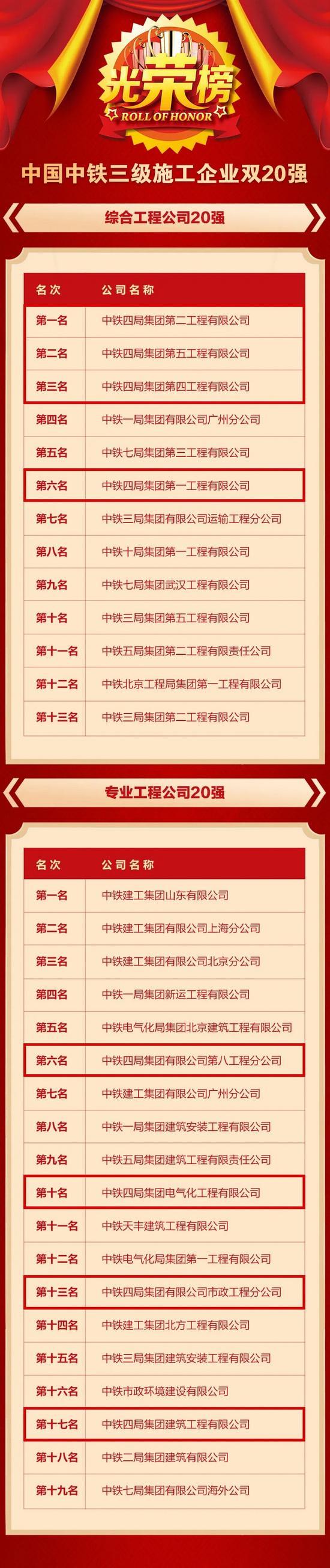 中铁四局8家单位强势登榜中国中铁三级公司双20强,再次包揽综合公司前三名