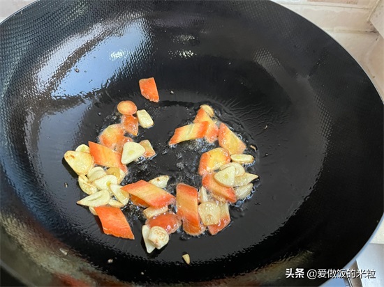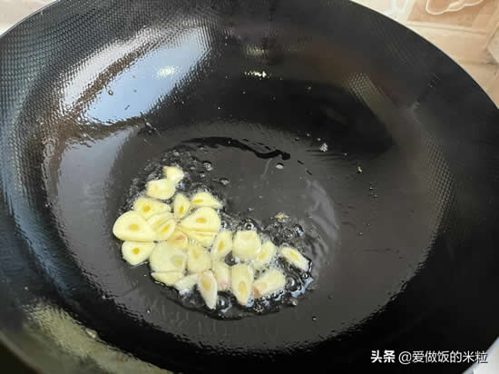 6、锅中不用再放油,就利用炒鸡蛋剩下的油就可以。把油烧热以后,下入蒜片爆香。