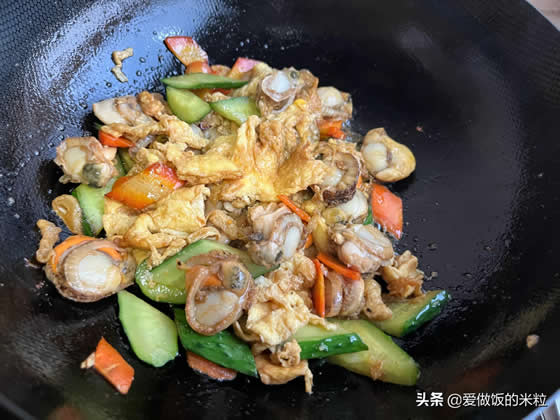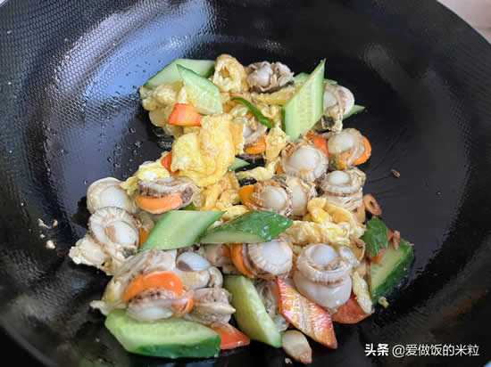 8、下入黄瓜,鸡蛋和扇贝肉,翻炒均匀。