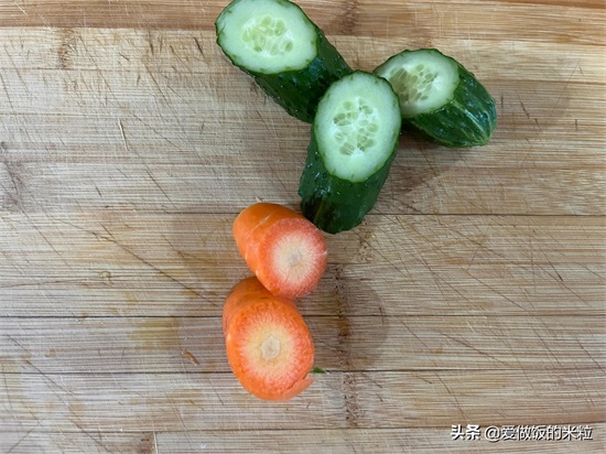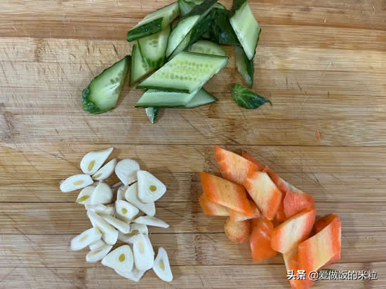 5、把黄瓜,胡萝卜和大蒜清洗干净。蒜切成片,用来炝锅。黄瓜和胡萝卜先斜刀切成小段,然后再从侧面切,切成菱形片,用来作为配菜。