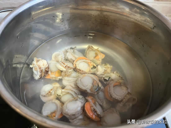 2、锅中放入水,加入两大勺料酒,加入料酒的目的是为了去除腥气。把水烧开,下入扇贝肉焯水,立马捞出来,时间不能超过五秒钟。否则扇贝肉就会缩水,变得非常小,肉质变得很硬。