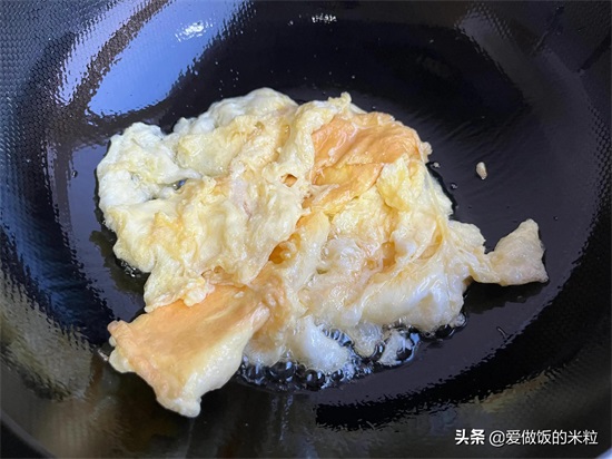 4、锅中放入油,要热锅凉油,这样不粘锅。把油烧热以后,下入蛋液。一面炒的初步成型以后翻过来炒另一面。注意,蛋液成型,就可以盛出来了,鸡蛋不要炒老。