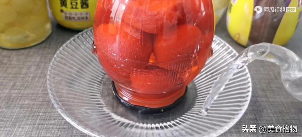 这次我们要用到一个小工具,一把小剪刀,用剪刀尖在瓶子和罐头盖之间找一点点缝隙,从这个缝隙处插入剪刀的尖儿,稍微给它撬一撬,只要这个空气能够进去一点,这个瓶盖就会特别方便可以拧开,这就像是我们平时去拔罐一样,拔罐的时候罐子里面的气比较少,这样就会紧紧的吸住,而在个我们给它放气之后,罐子就会特别轻易的可以直接被拿下,用剪刀轻轻给它放过一点点气之后,在拧罐头瓶的时候就可以非常轻易的拧开。最开始的时候罐头瓶的盖子是凹陷进去的,放完气之后,罐头瓶盖就会鼓出来,这样在拧的时候就会特别方便。