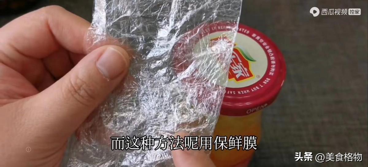 适合小的罐头瓶,需要用到的是保鲜膜,取一张保鲜膜,给它对折起来,折成一个长方形之后再次对折。保鲜膜这种材质看似薄薄的,但是它特别的有韧性,而且当a面和B面重叠在一起的时候,粘性也非常大,所以我们用保鲜膜可以当做一个防滑材料,对折三次之后,这个宽度和罐头瓶差不多就可以了,把它垫在罐头瓶上面,这样拧的时候就可以加大摩擦力,轻轻的一拧,罐头瓶就可以被打开,这个原理就是在我们手和罐头瓶盖之间加入了保鲜膜,这样的话摩擦力增大,拧的时候就更加轻松。不过这个方法比较适合这种小一点的罐头瓶盖,我们手可以完全将盖子握住,这样的话更方便使劲,如果瓶子比较大的话,这个方法就不适用了。