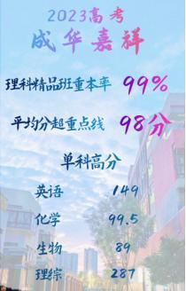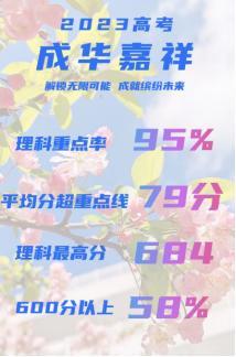 成华嘉祥理科最高分684分,理科重点率95%,理科精品班重本率99%,600分以上58%。单科高分:英语149分,化学99.5分,生物89分,理综287分。