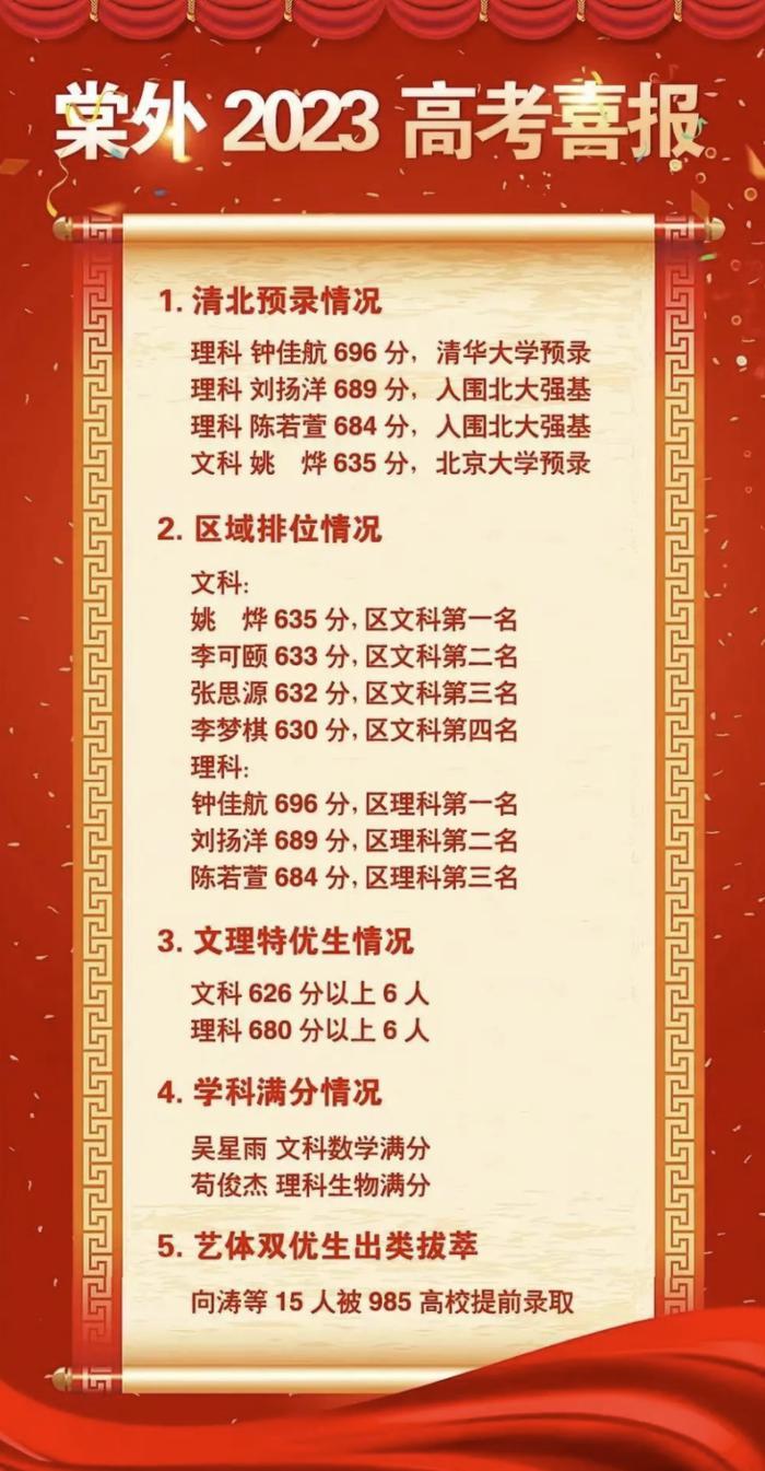 今年棠外清华北大预录都有,文科626分以上6人,理科680分以上6人,单科满分的同学也有两名。