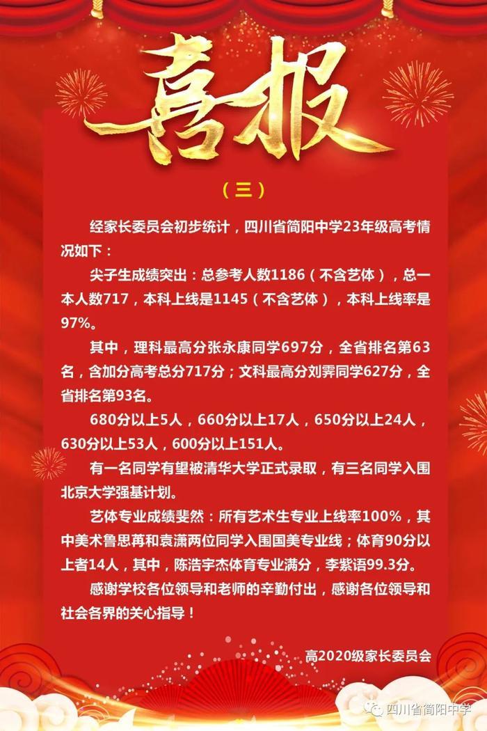 简阳中学理科考生张永康取得了697分的好成绩。其中,语文128分,数学141分,外语140分,理综288分(物理107分,化学96分,生物84.5分)。全省排名63名,含加分717分。